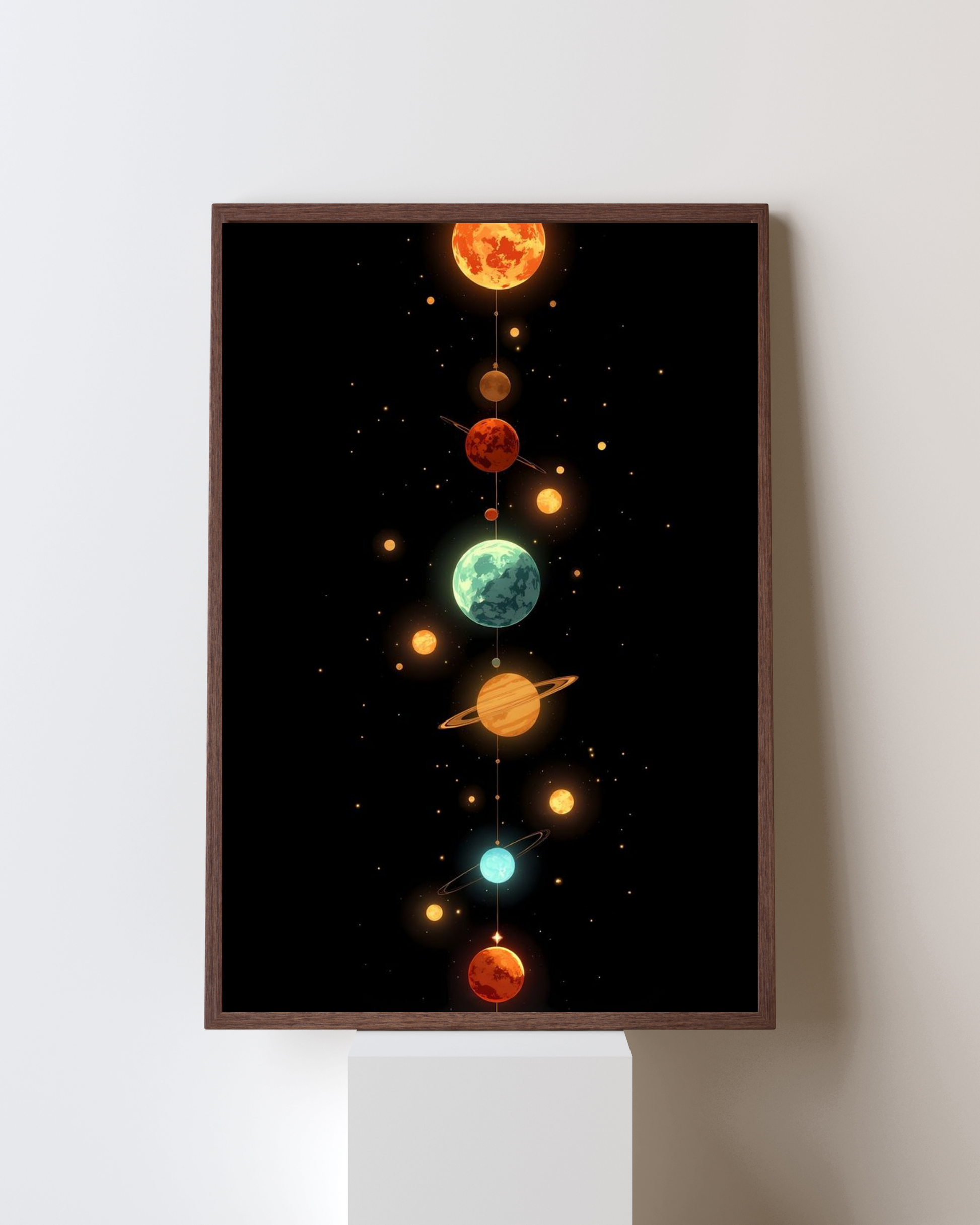 Bring the mysteries of the universe into your space with Cosmic Alignment, a striking art frame showcasing a vertical alignment of colorful planets against a deep black cosmos. Each glowing orb represents the harmony of celestial beauty, from radiant suns to ethereal blue worlds.