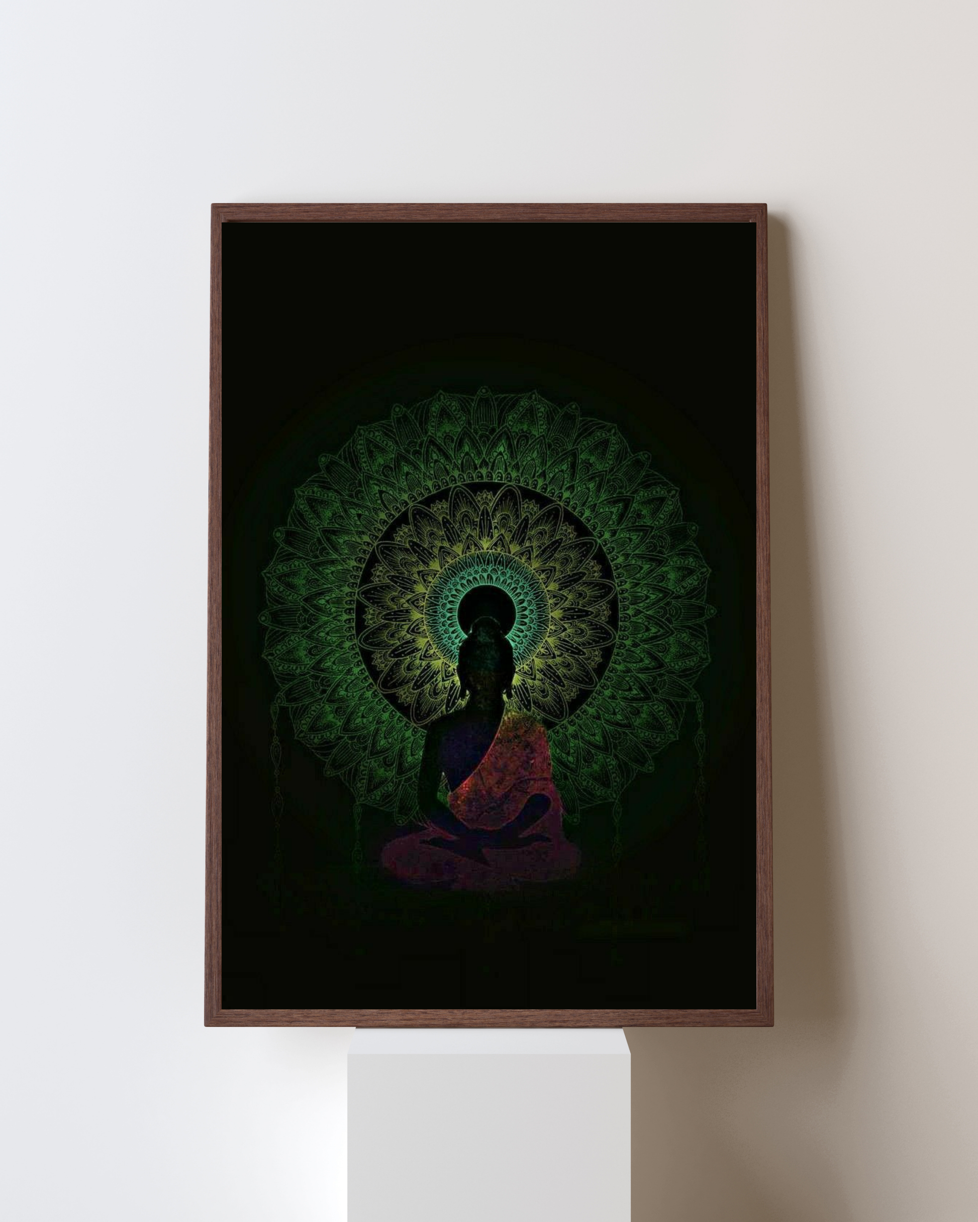 Transform your space into a sanctuary of peace and reflection with Ethereal Enlightenment, a mesmerizing Buddha-inspired wall frame that merges sacred geometry with meditative calm. Featuring a luminous mandala radiating from a serene silhouette of Buddha, this piece symbolizes mindfulness, balance, and inner awakening.