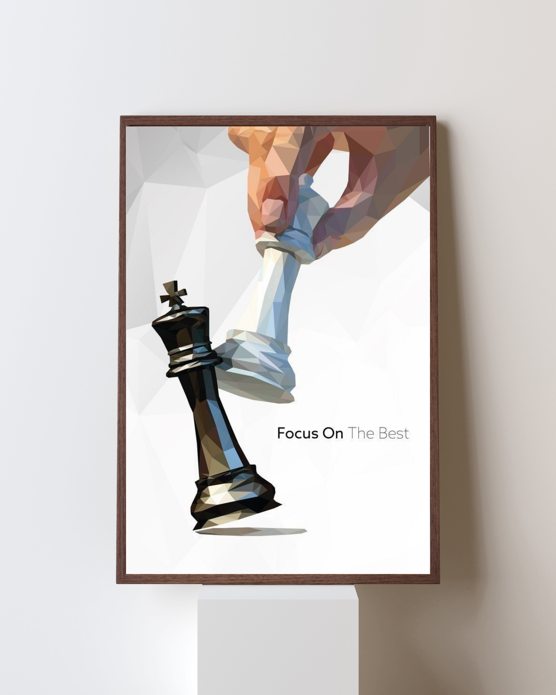 Inspire a winner’s mindset with this striking geometric chess artwork, featuring a hand confidently moving the white piece to victory. The bold message “Focus On The Best” reinforces clarity, discipline, and strategic thinking—perfect for those who strive to lead, plan, and succeed.