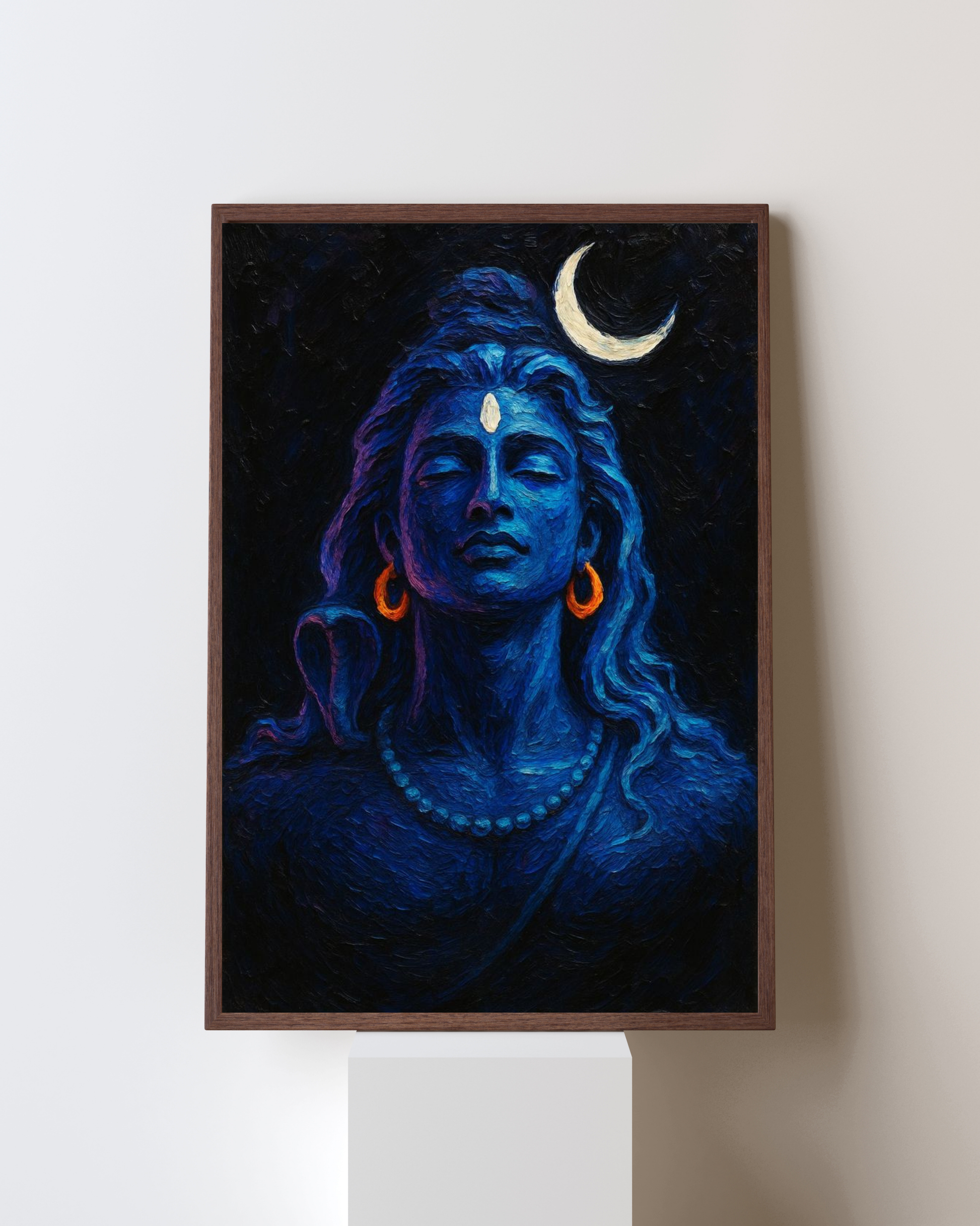 This breathtaking artwork captures Lord Shiva in deep meditation under the crescent moon, his calm expression radiating profound peace and inner strength. The vivid blue tones symbolize infinite consciousness, while the touches of orange and white add a divine contrast, representing energy and purity.
